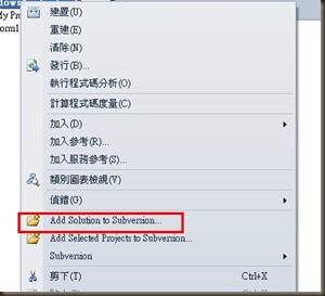 到方案總管上的專案按下右鍵,點選 Add Solution to Subversion…