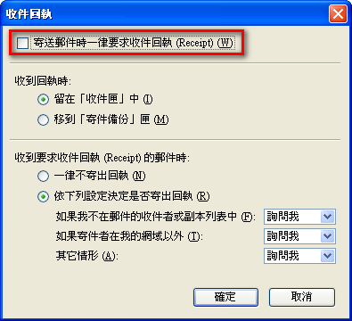 在 Thunderbird 中也有e-mail 讀取回條功能,可在工具 –> 選項裡進行設定,也可在寄信時,才選擇回條 功能,兩種設定方式。 第一種方式: SETP 1.點選工具 SETP 2.點選選項 SETP 3.進階 –> 收件回執 SETP 4.勾選寄送郵件時一律要求回執 第二種方式: 直接在寄信時,點選選項 –> 收件回執即可。